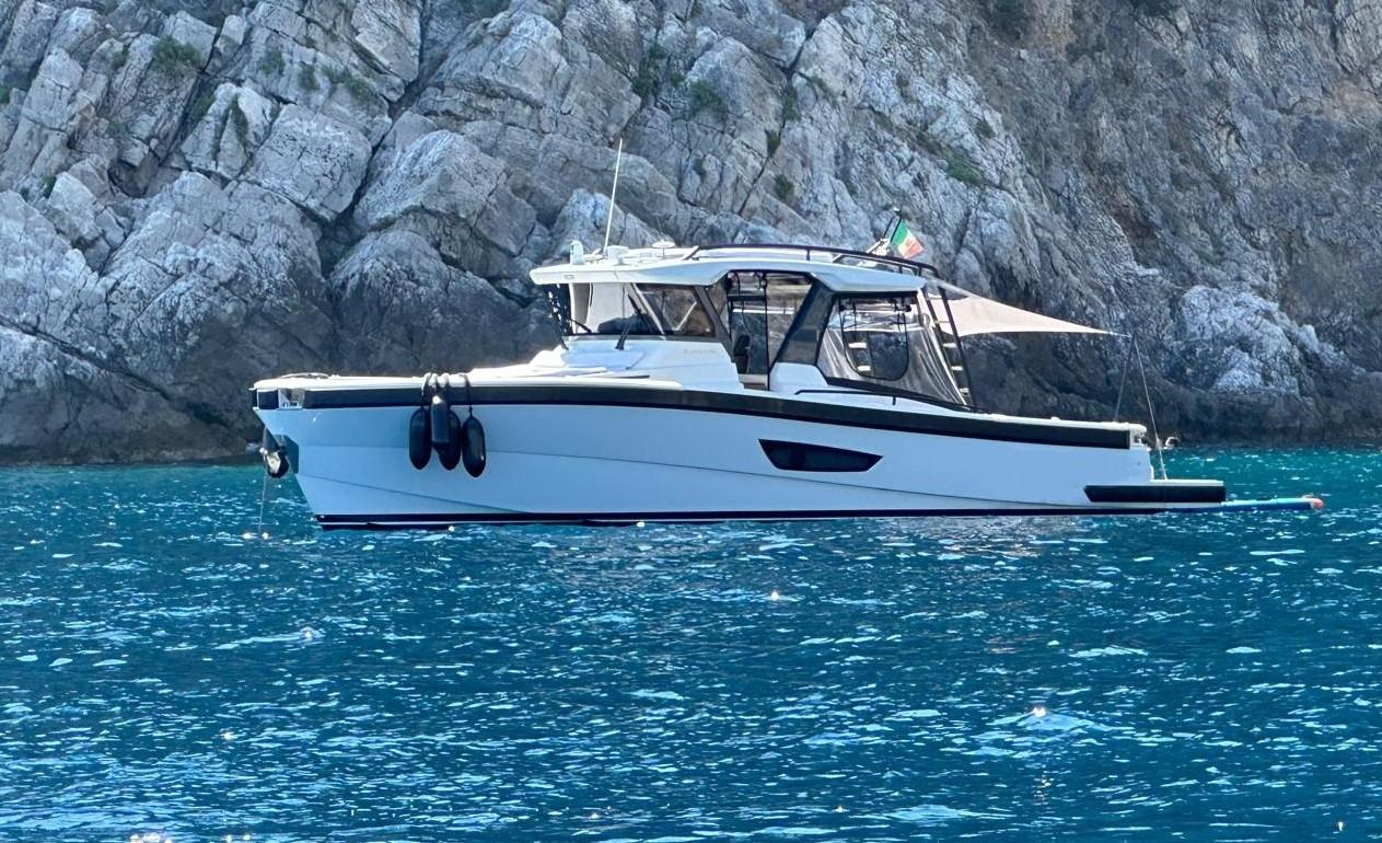 Delivered to its first and only owner in April 1999, this AB Yachts Follia 75 is a large and fast Sport Yacht with Hamilton Jet propulsion and combines the highest standards of fittings and finishes with excellent maneuverability and seaworthiness. The Follia 75 is an upgrade of previous designs, with more powerful engines and a deep V hull to provide faster and more comfortable navigation at sea. Two Deutz engines of 1850 HP each provide impressive power to the water jets via Twin Disc reducers. The vessel is constructed with closed-cell foam between layers of composite. Inside the laminate, there is a layer of elastomer, which maintains the seal even if the laminate is damaged in a collision. The decks are made of aluminum honeycomb. This construction makes the Follia 75 very light but also very strong. Two transom doors allow access to the tenders. Another feature of the Follia 75 is its futuristic cockpit design and very intuitive controls. The reverse deflector and throttles are controlled with a single lever, and there are three idle speeds to choose from for precise maneuvers.