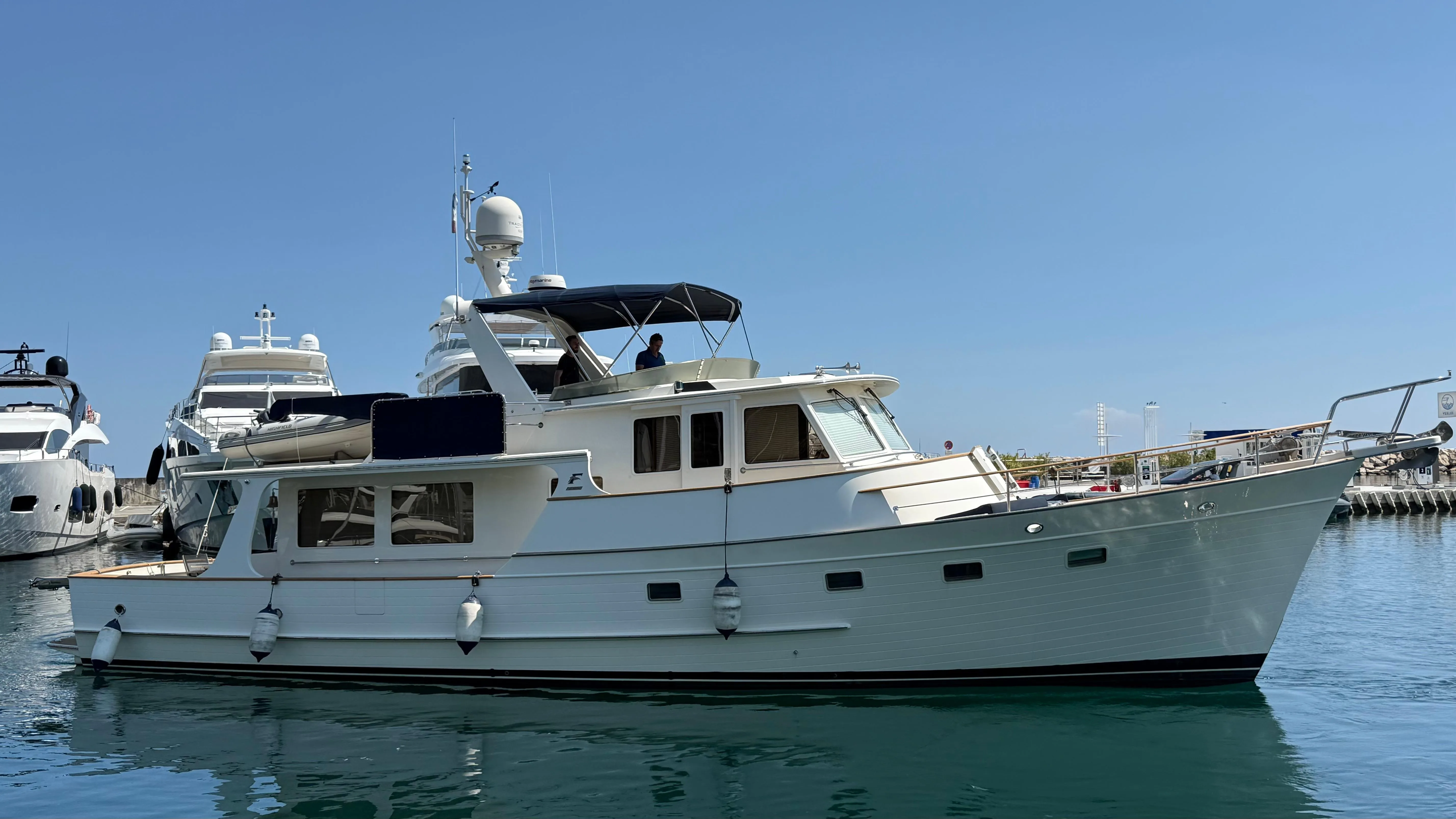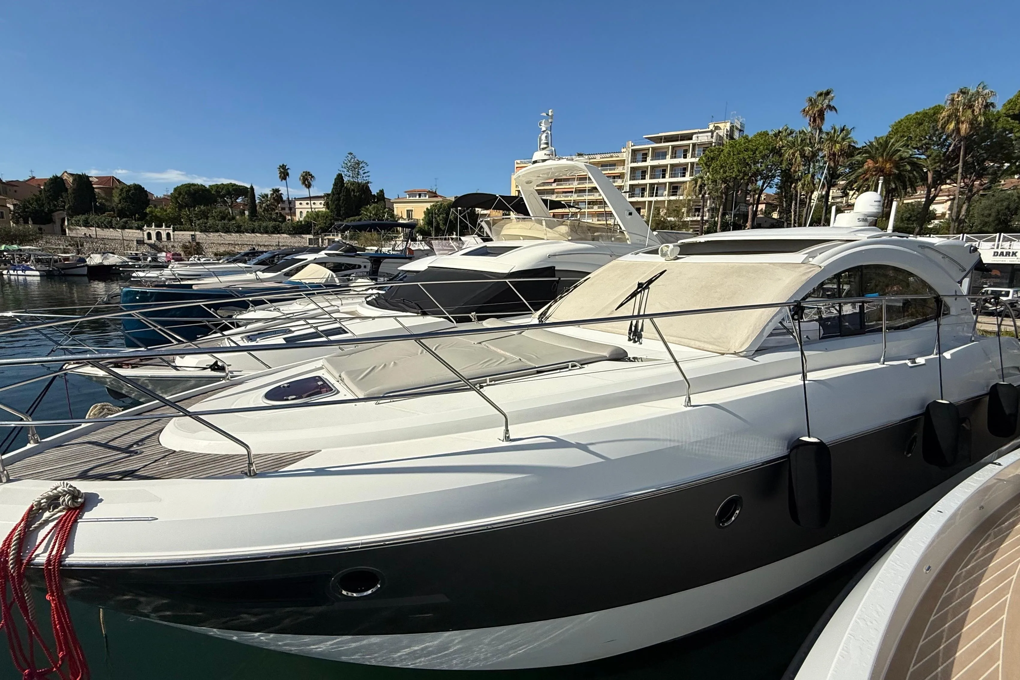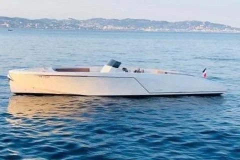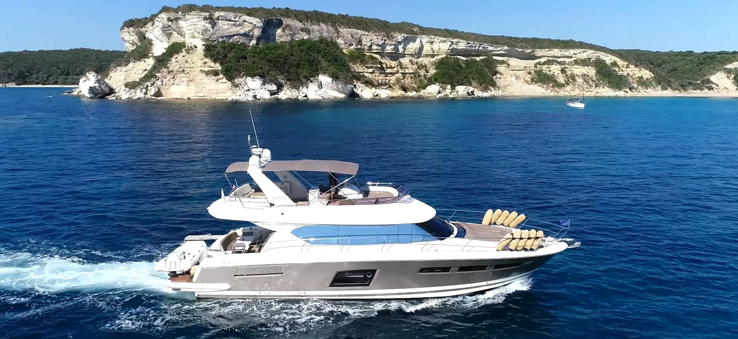 The interior offers a spacious, bright, and warm salon, ideal for life on board, complemented by a fully equipped kitchen and two double cabins, each with its own private bathroom. The layout is designed for comfortable cruising use, whether with family or friends. The helm station on the flybridge benefits from an unobstructed view and complete equipment, while the aft cockpit offers ample space for relaxation or water activities.