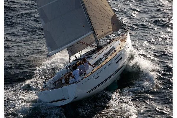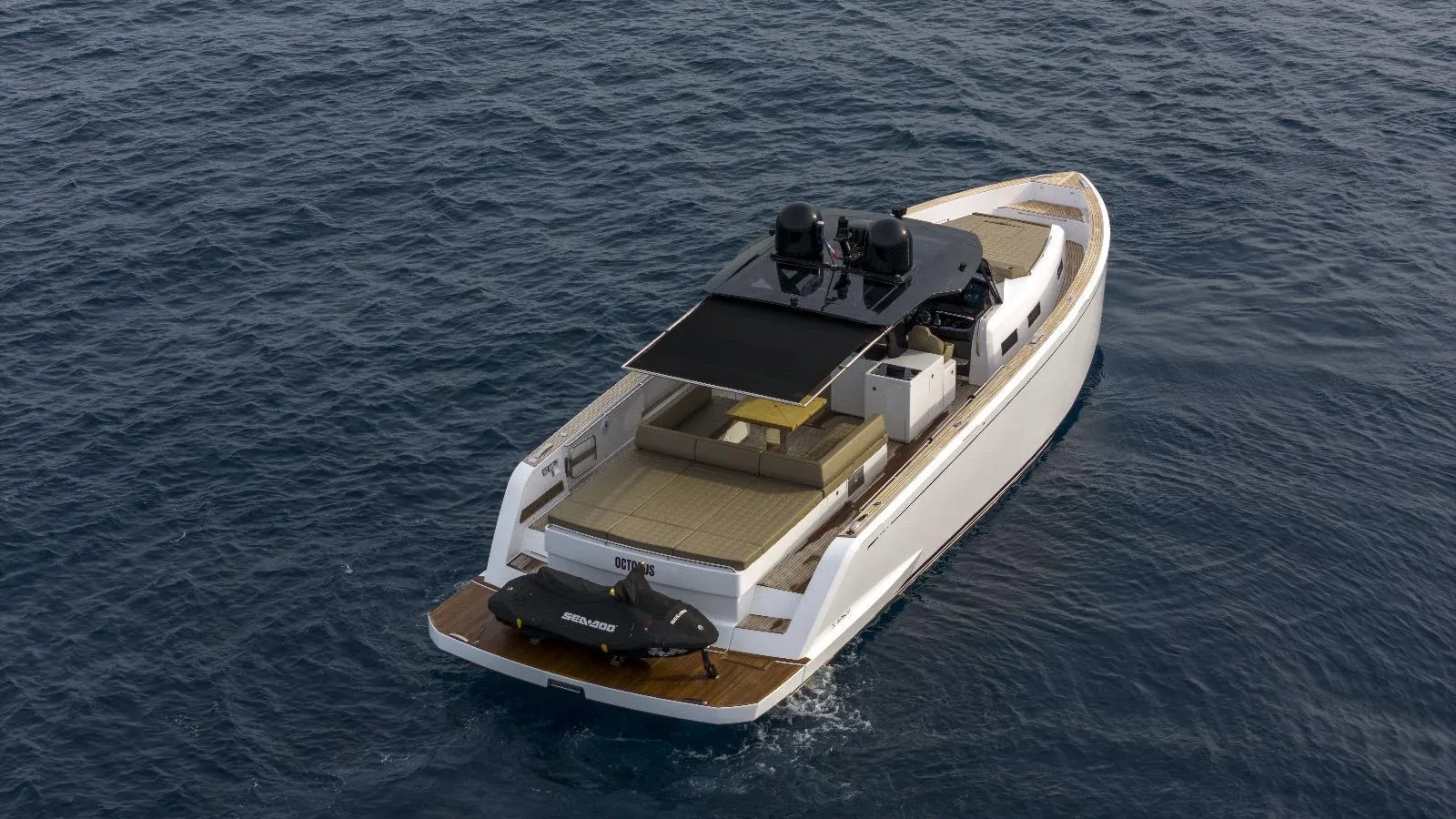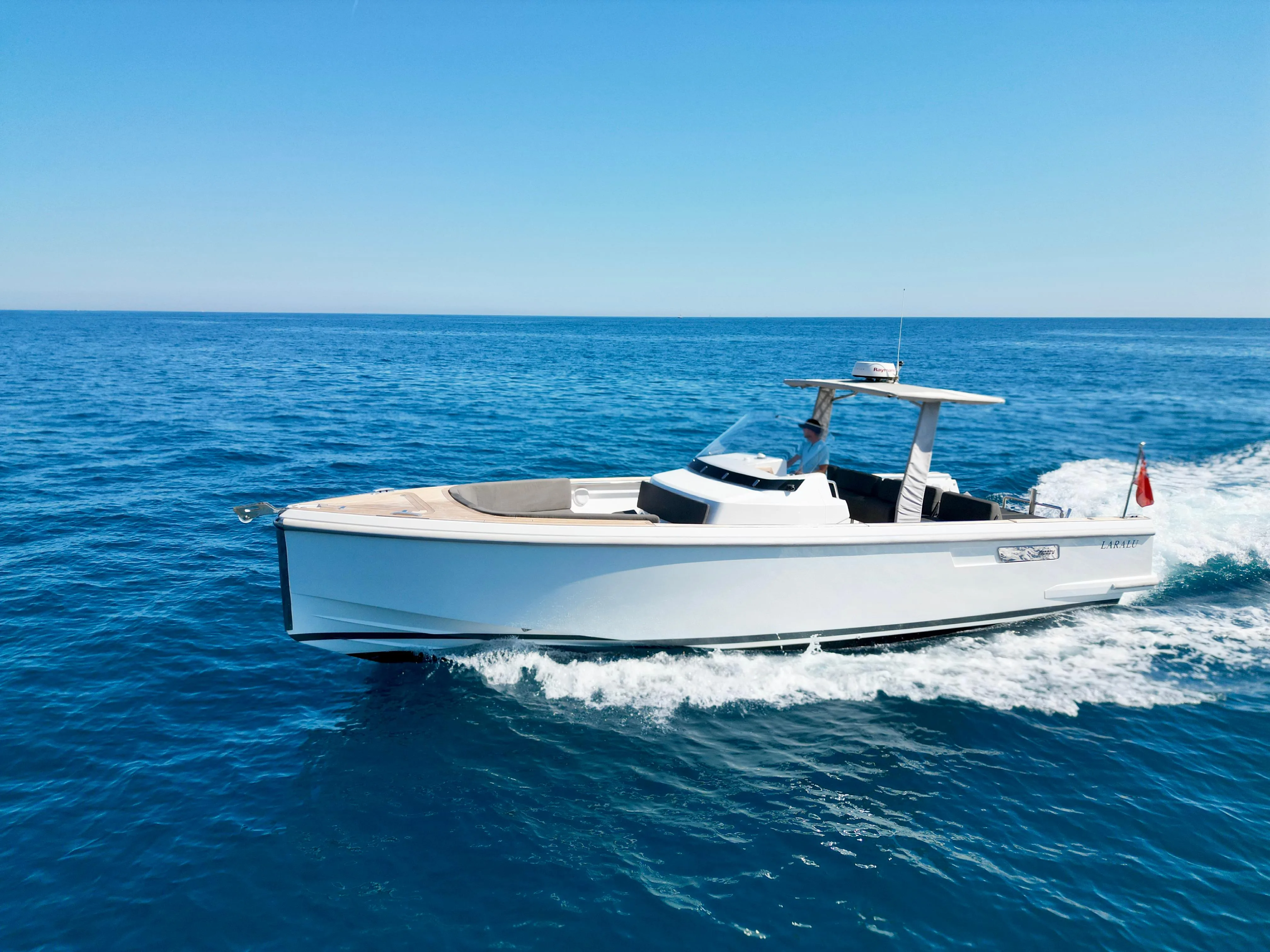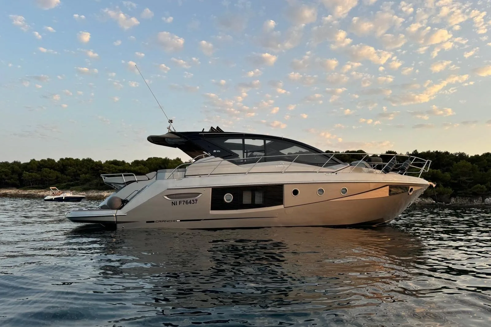 The interior offers a spacious, bright, and warm salon, ideal for life on board, complemented by a fully equipped kitchen and two double cabins, each with its own private bathroom. The layout is designed for comfortable cruising use, whether with family or friends. The helm station on the flybridge benefits from an unobstructed view and complete equipment, while the aft cockpit offers ample space for relaxation or water activities.