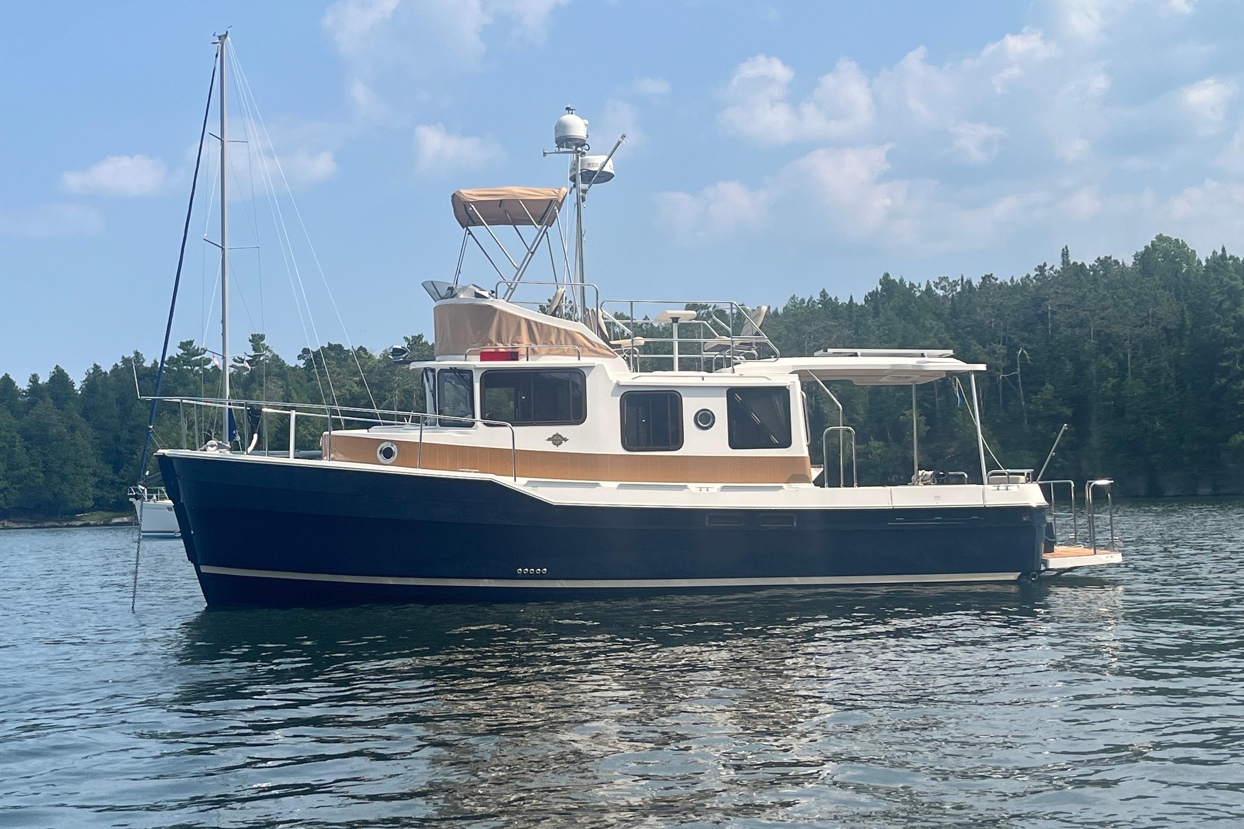 flush-mounted overhead lighting, creating a warm and inviting ambiance from sunrise to starlit evenings. A removable stainless-steel ladder provides access to the arch, where the mast and equipment are mounted atop a non-skid surface.