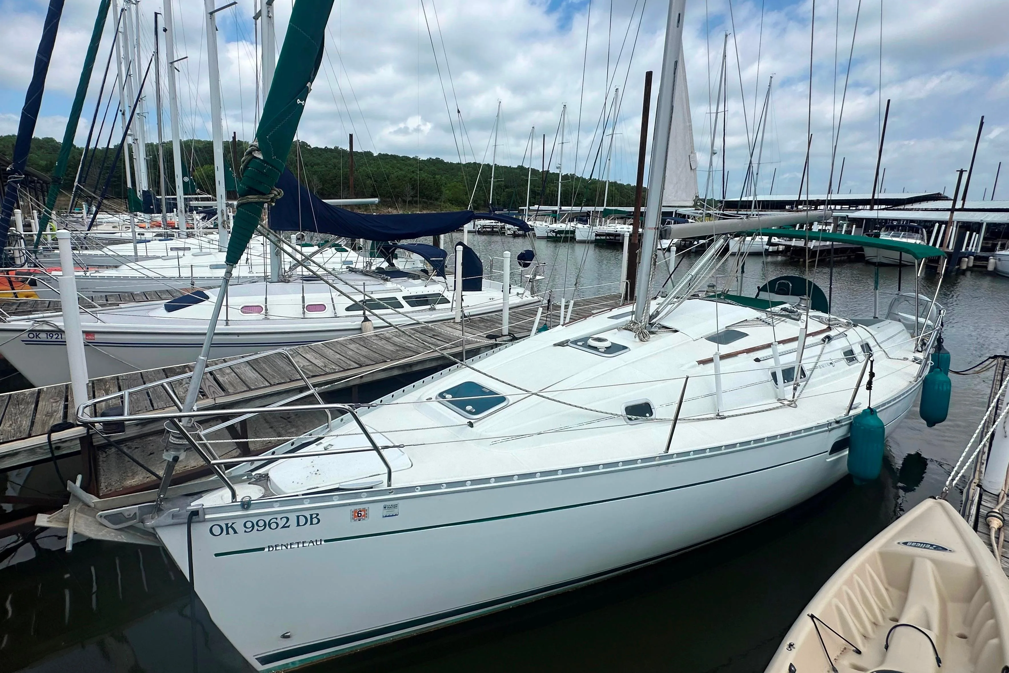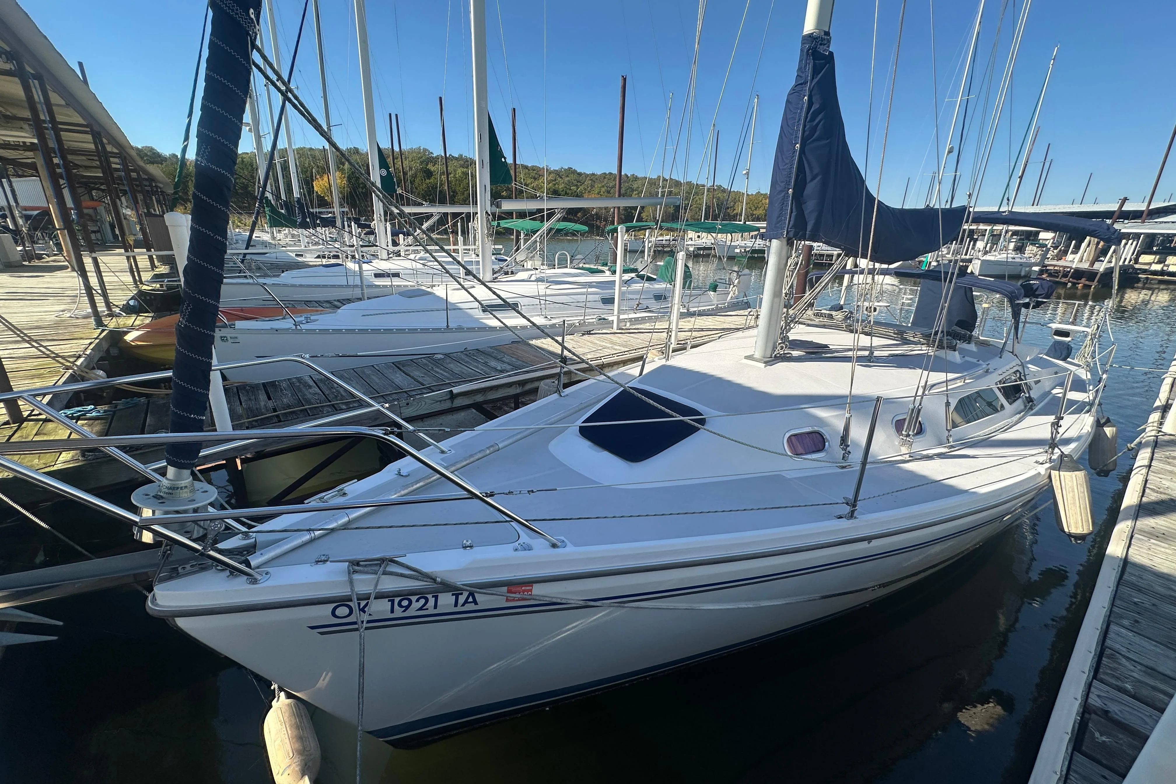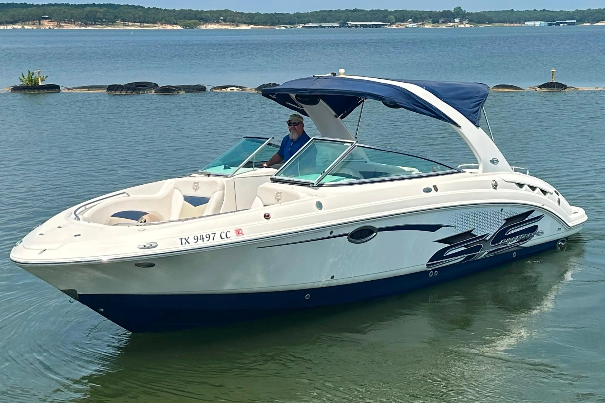 Inside, the cabin boasts a comfortable layout with a V-berth forward, a mid-cabin for extra sleeping space, and a fully equipped galley that includes a refrigerator, stove, and microwave. The dinette can easily convert to additional sleeping space, making the boat ideal for overnight trips. The head compartment is complete with a shower and toilet, ensuring convenience and comfort.