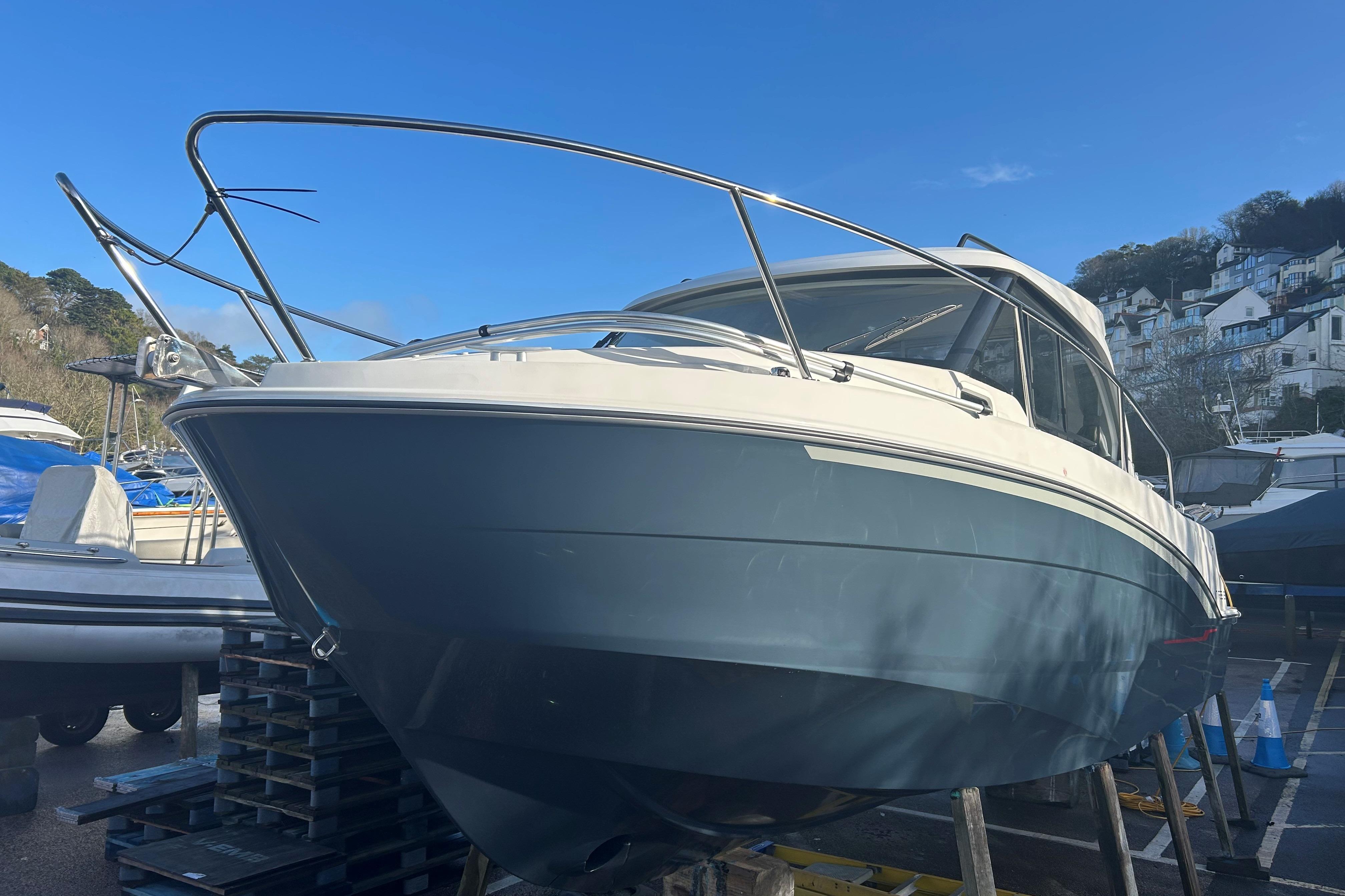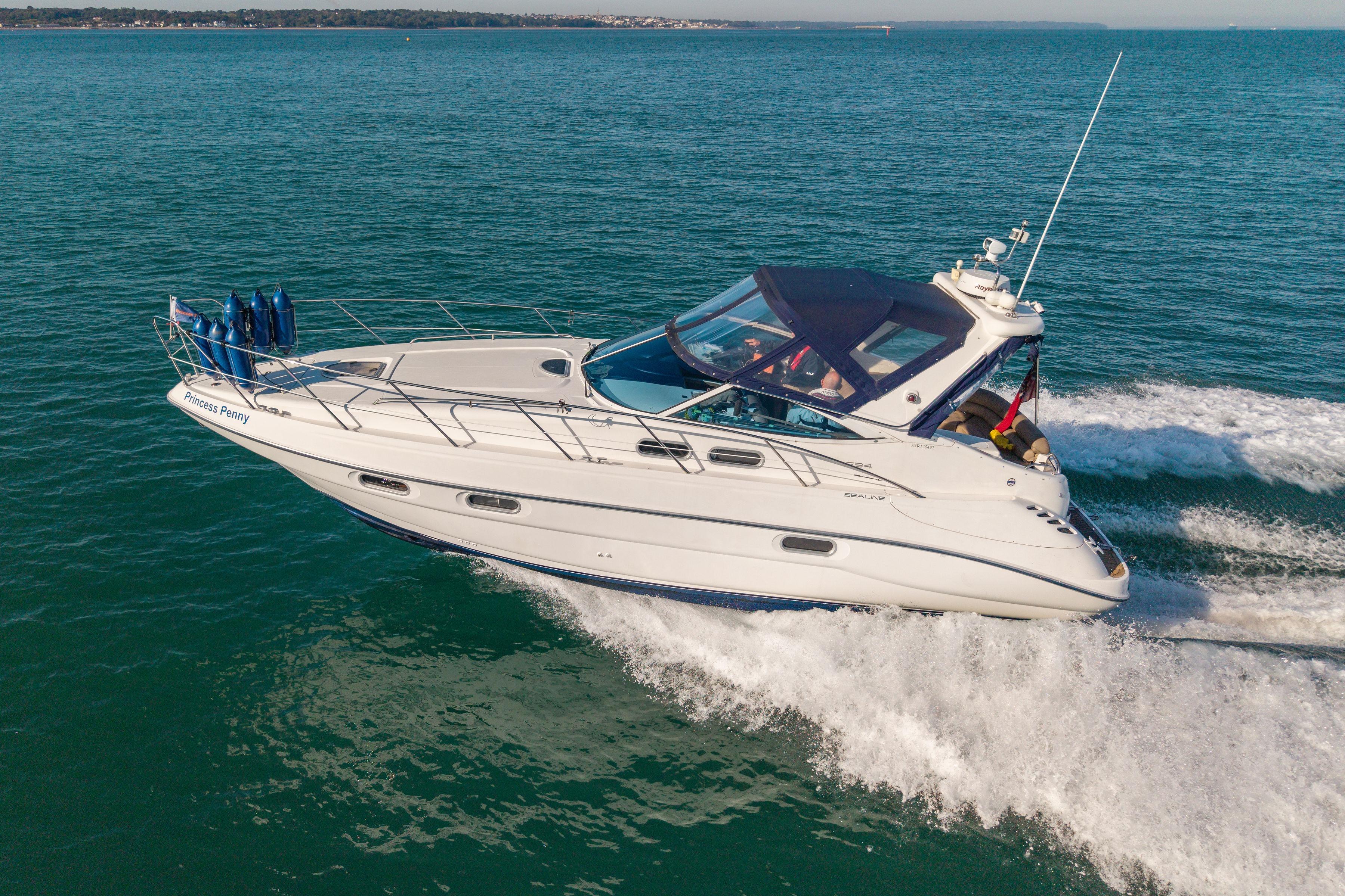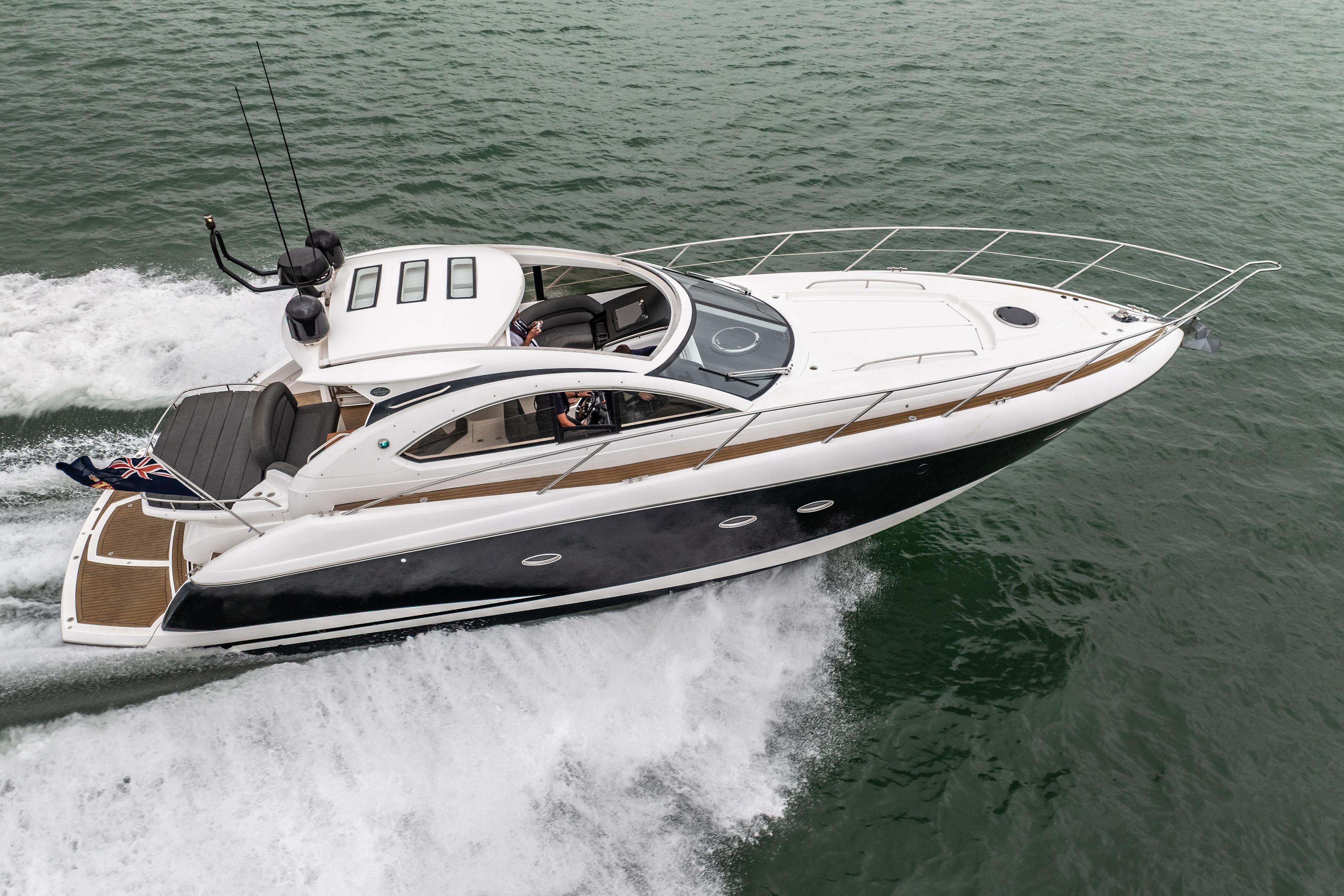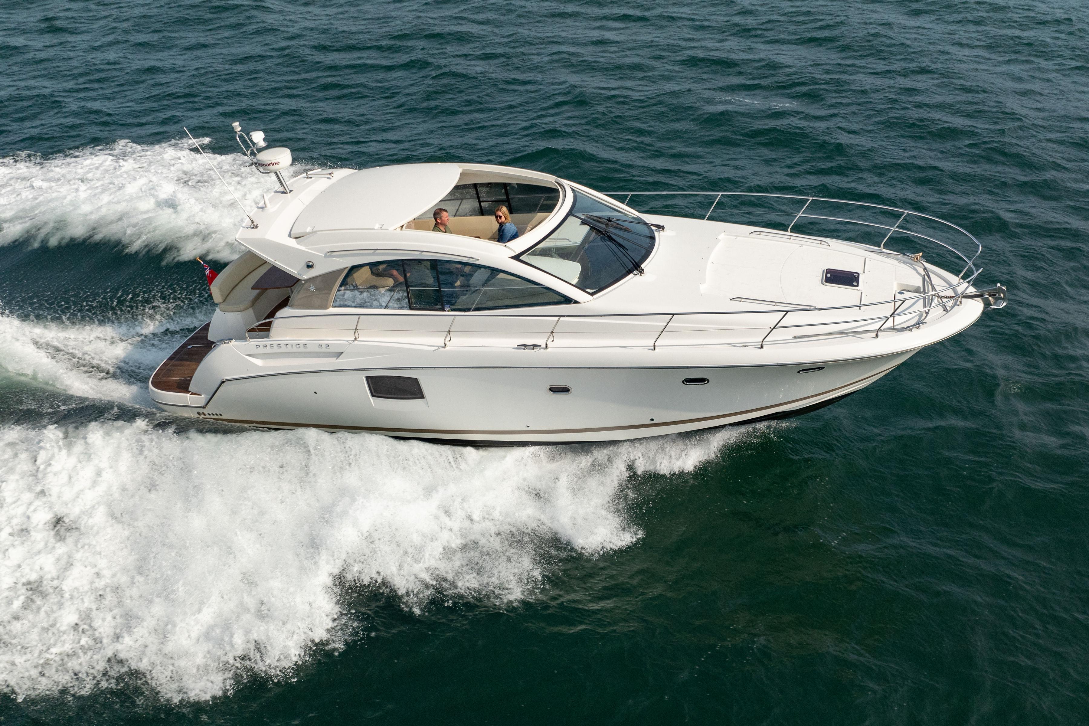 2021 Model, Built 2020 • UK tax paid • Twin Volvo Penta D4 (2x 300hp) Diesel engines • 2 cabins accommodating 4 guests • White hull • Teak cockpit and side decks • Webasto powered hardtop roof in saloon • Swim platform and boarding ladder • Bow thruster with remote control • Volvo Joystick • Raymarine AXIOM • Raymarine reversing camera • Inverter 3.5kW • Webasto diesel heater • Forward cabin with double bed • Fusion sound system • Full service including drives, anodes, antifoul April 2025