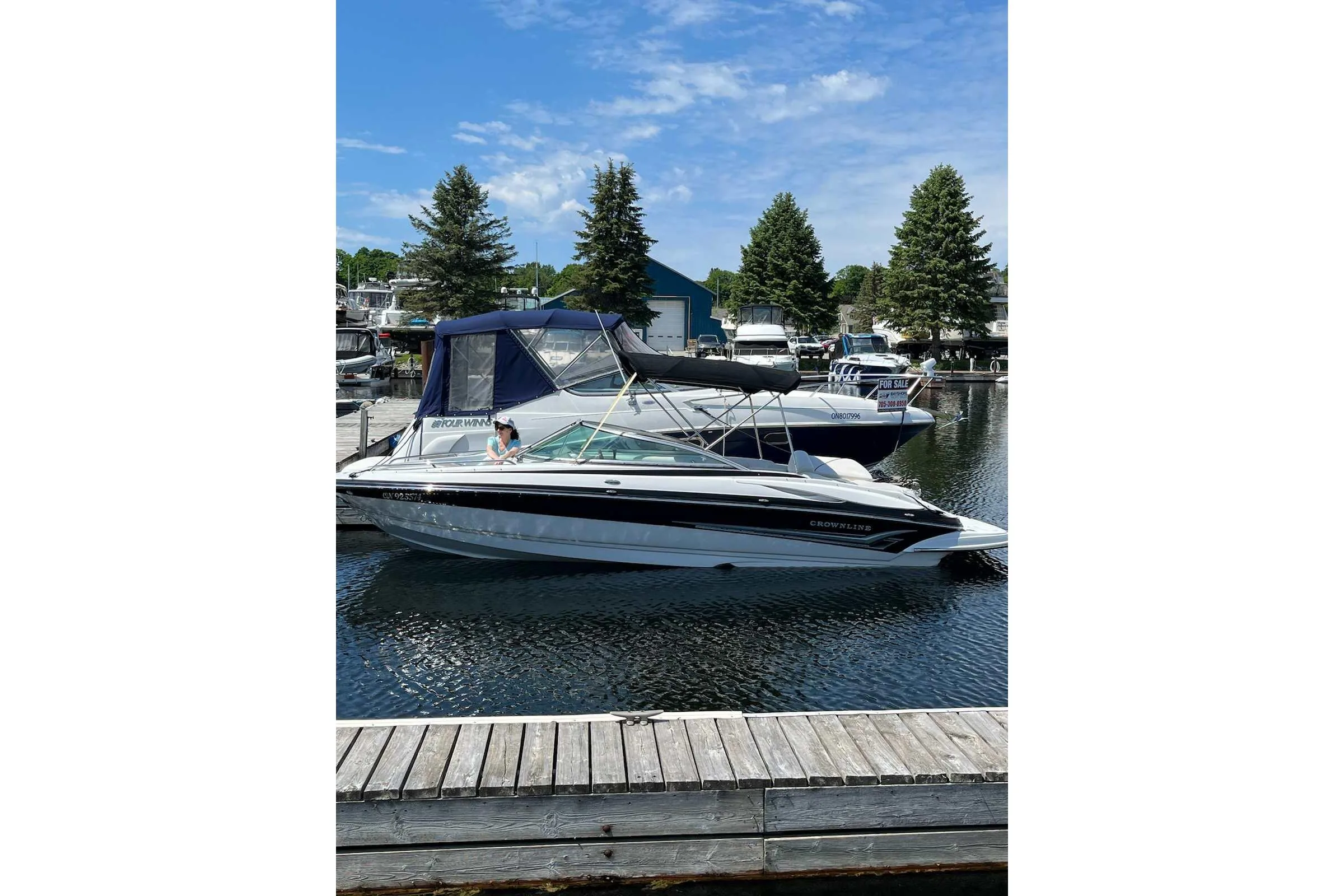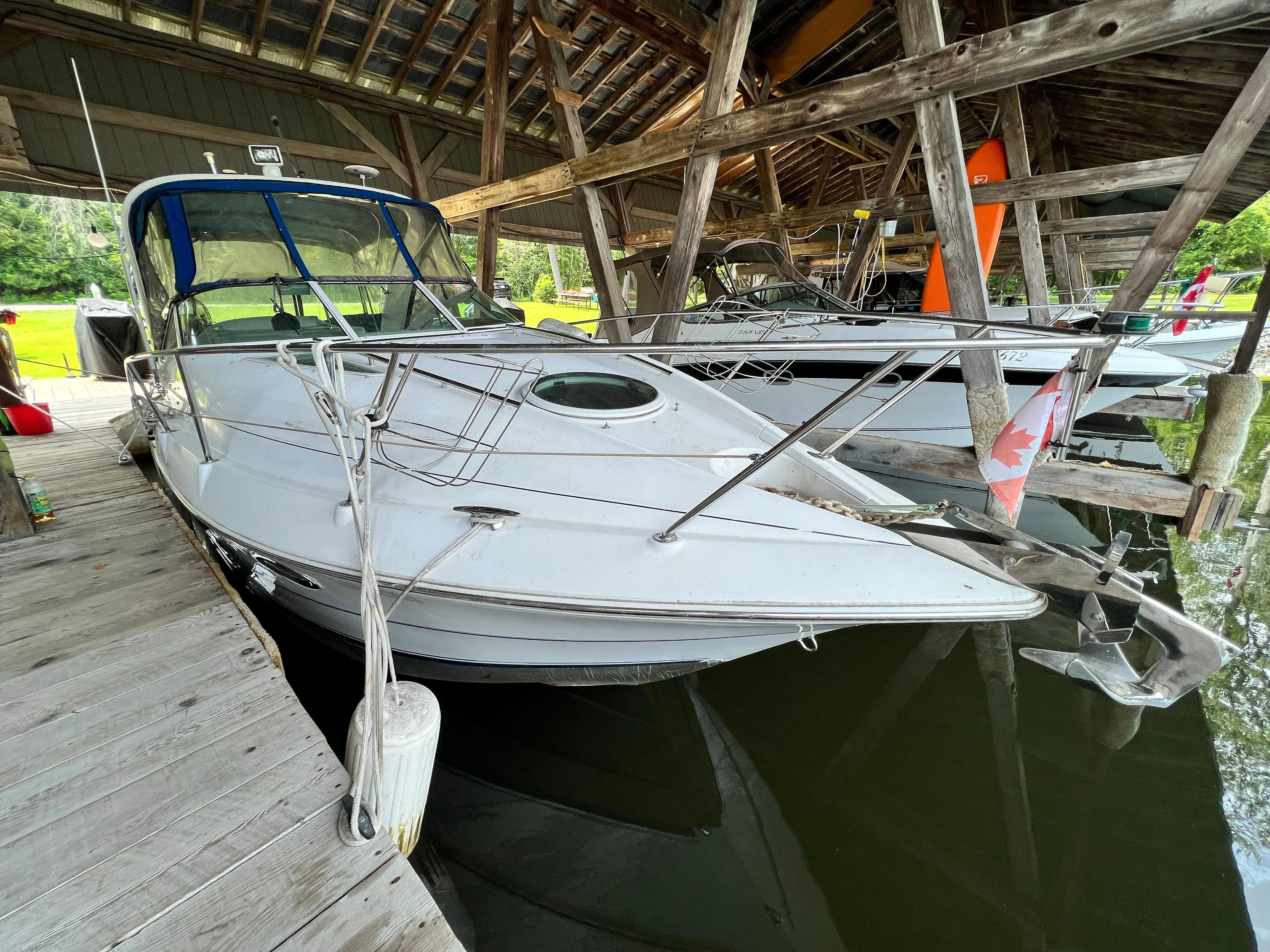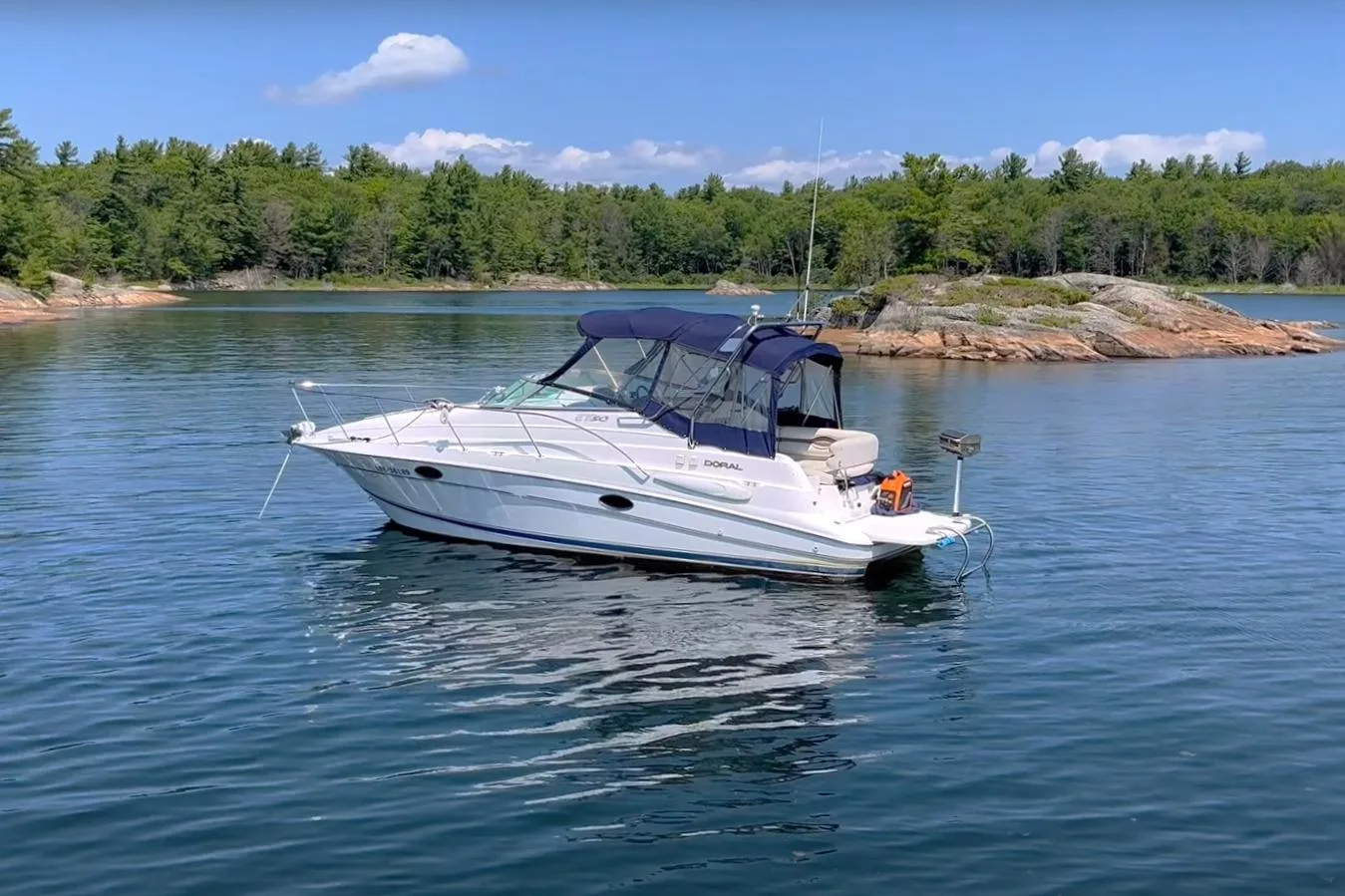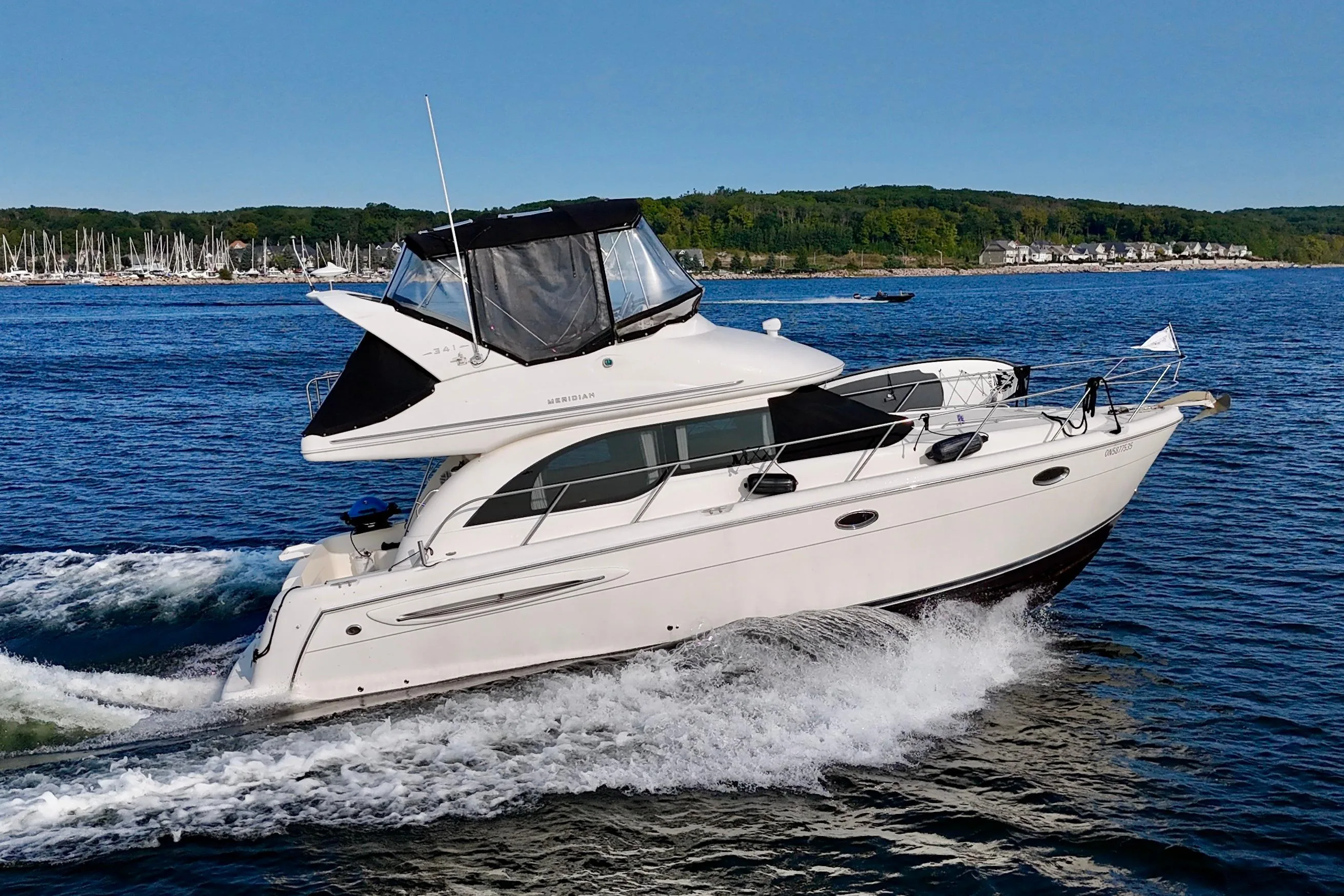 - Nested wind-break door in full windshield provides protection as well as easy bow access.