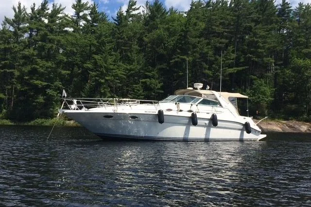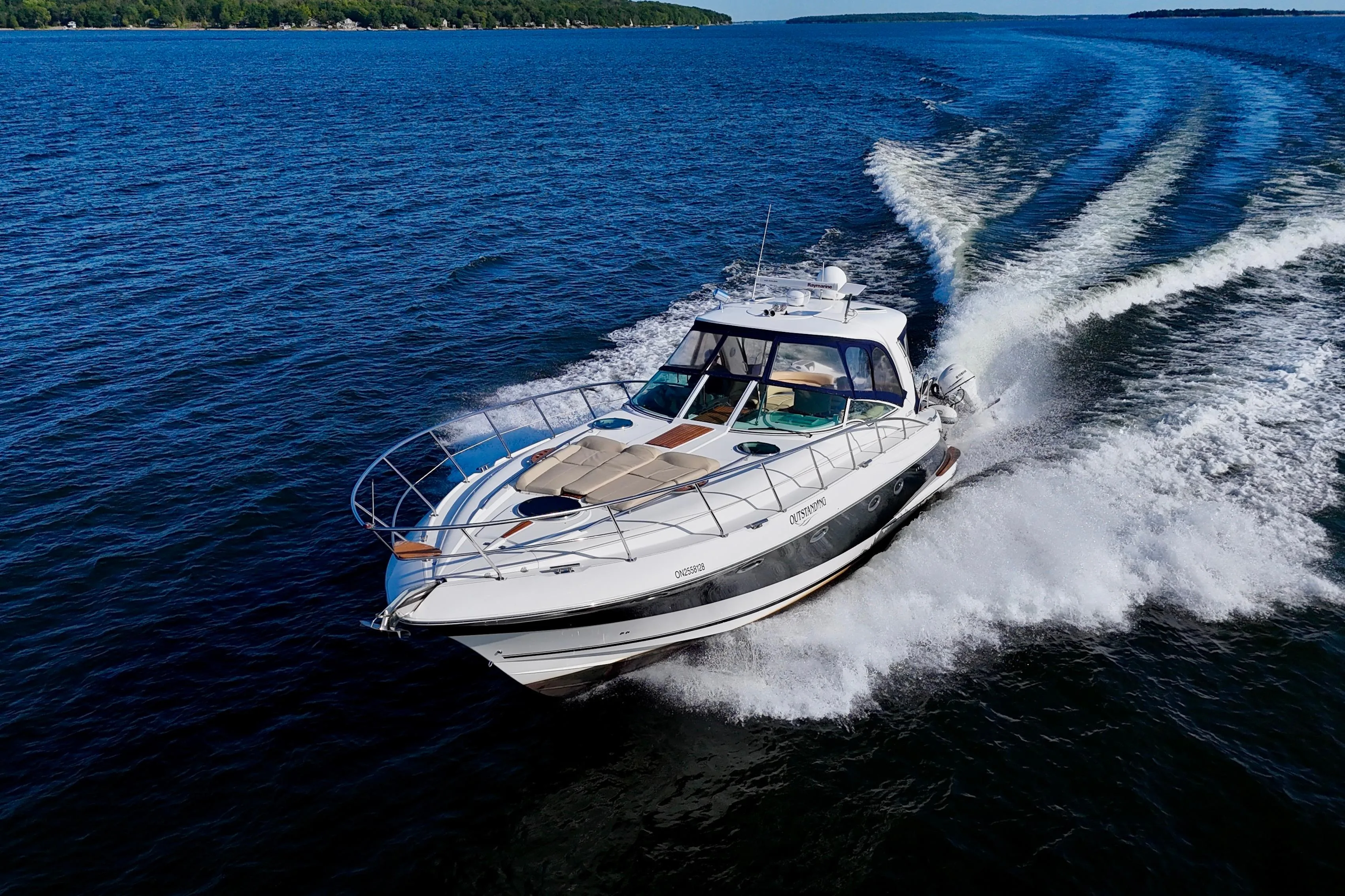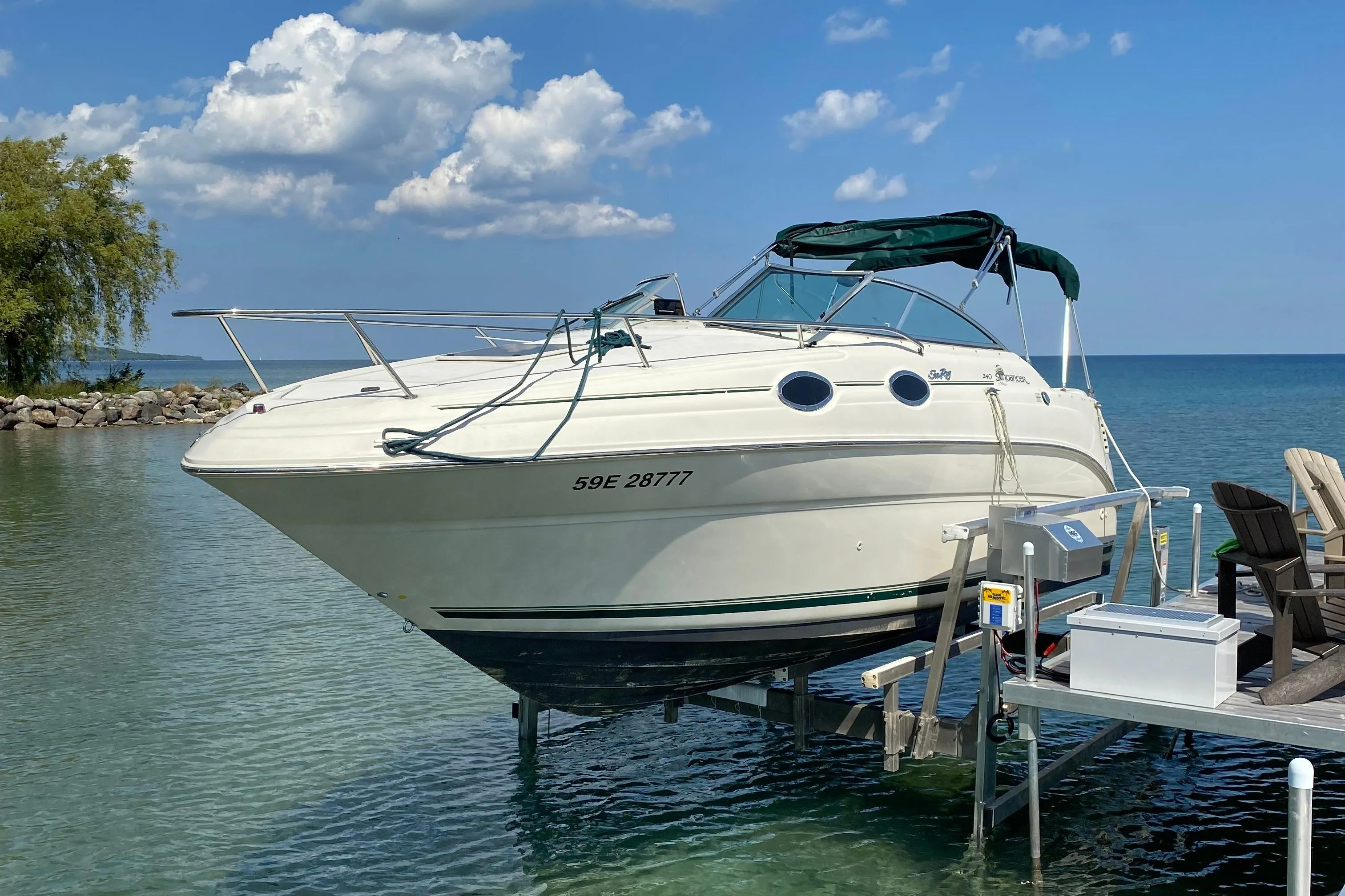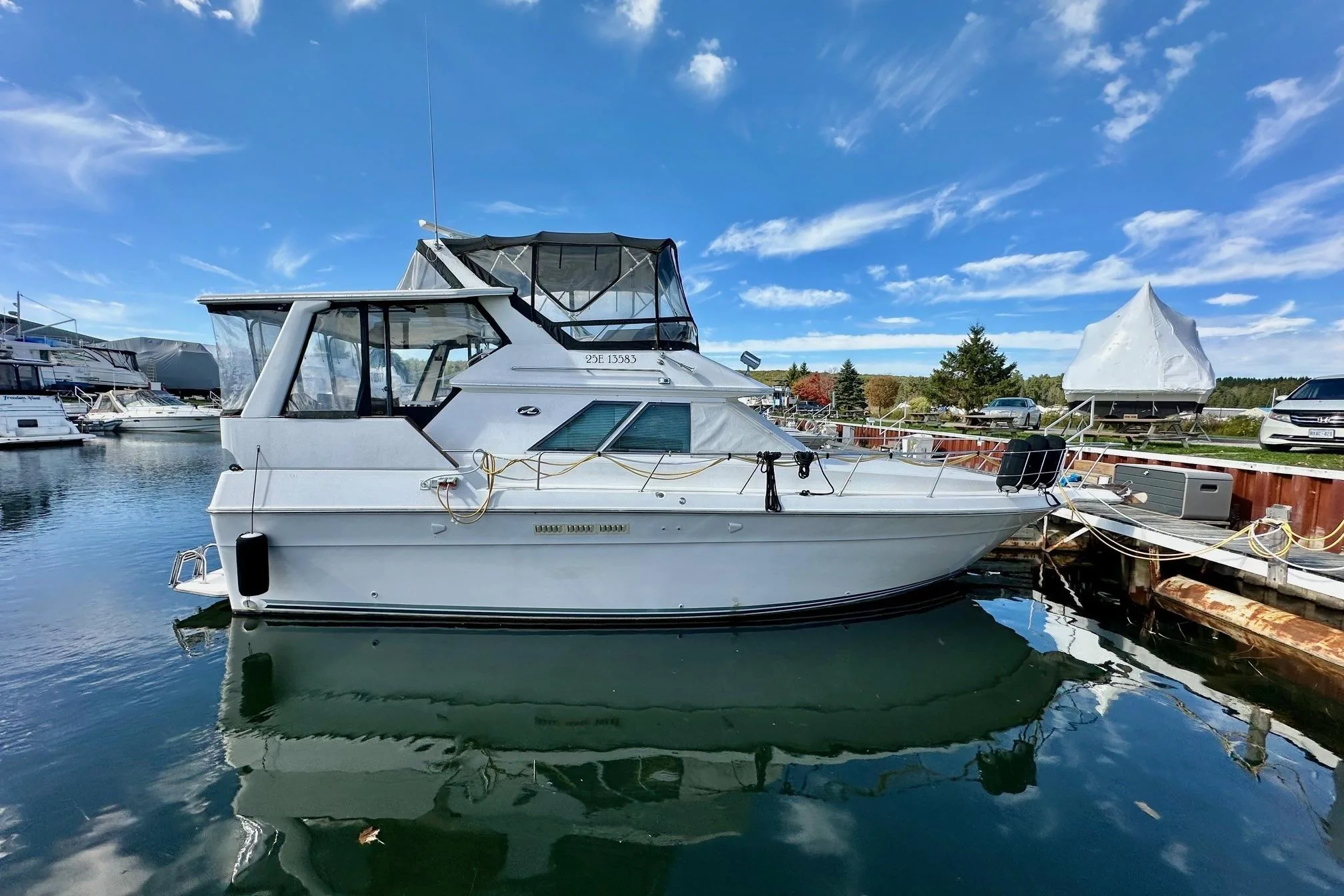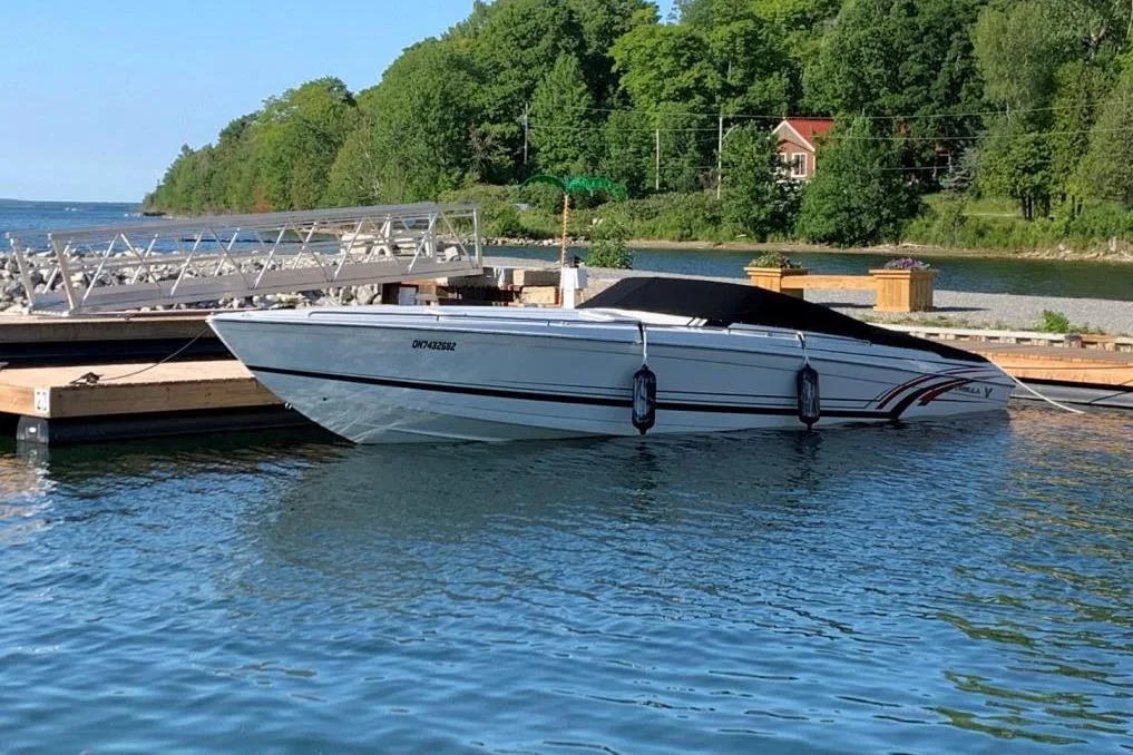 - Cabin features fully enclosed head with shower, galley, entertainment center and convertible V-berth for overnight stays