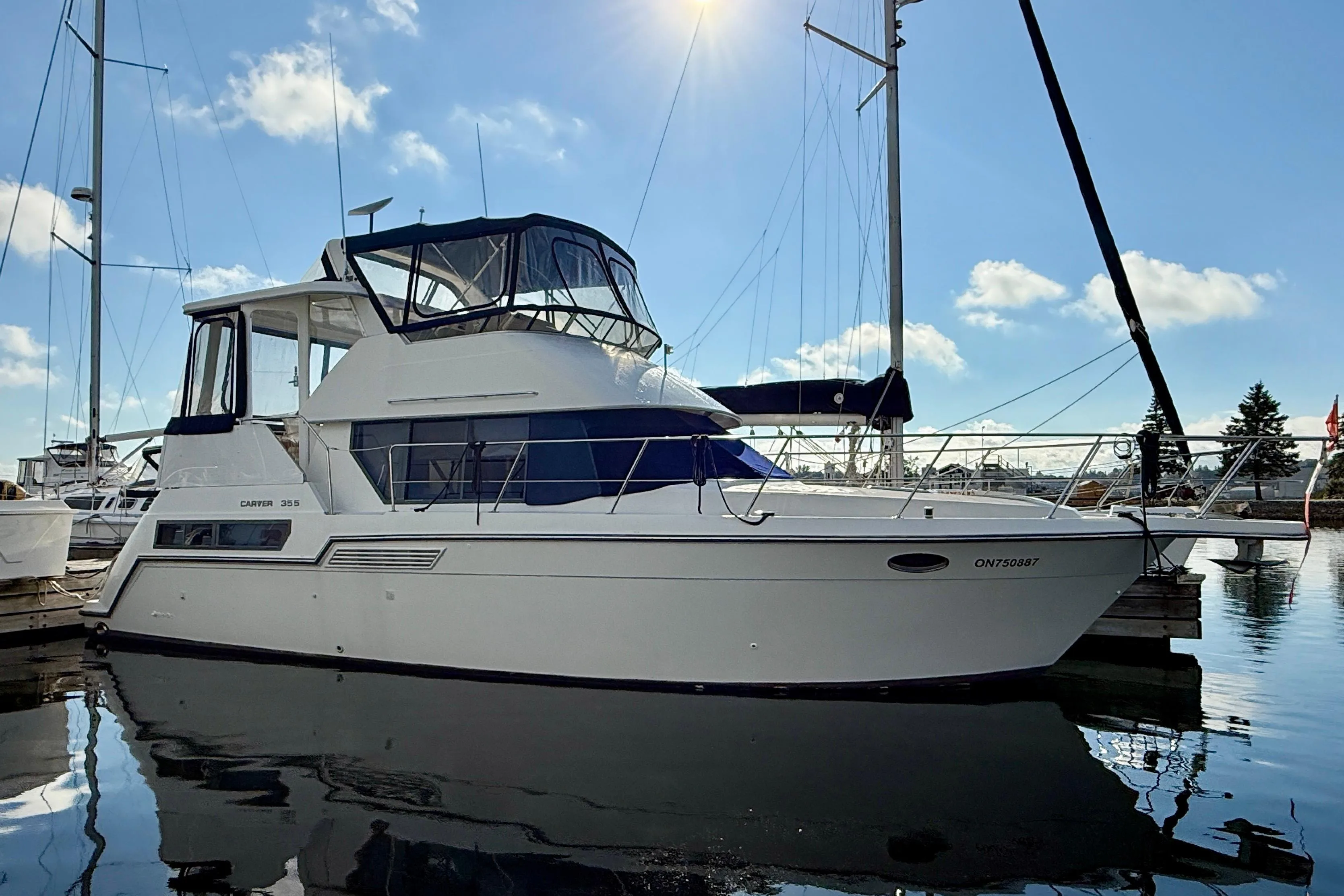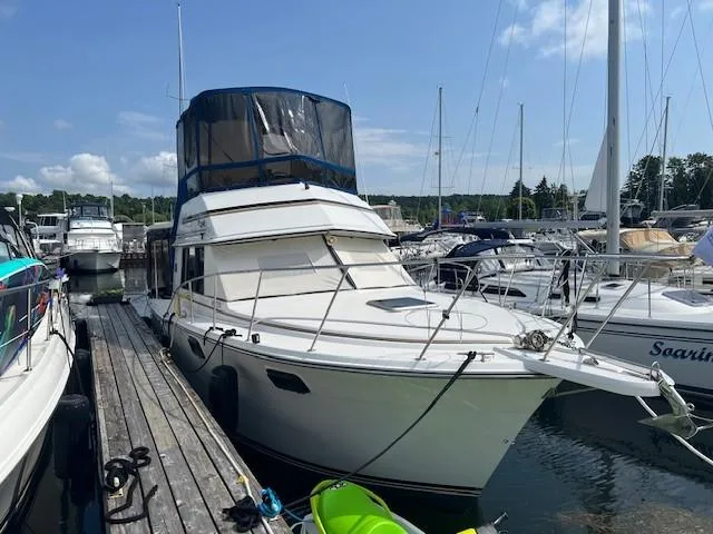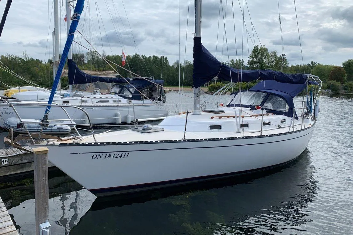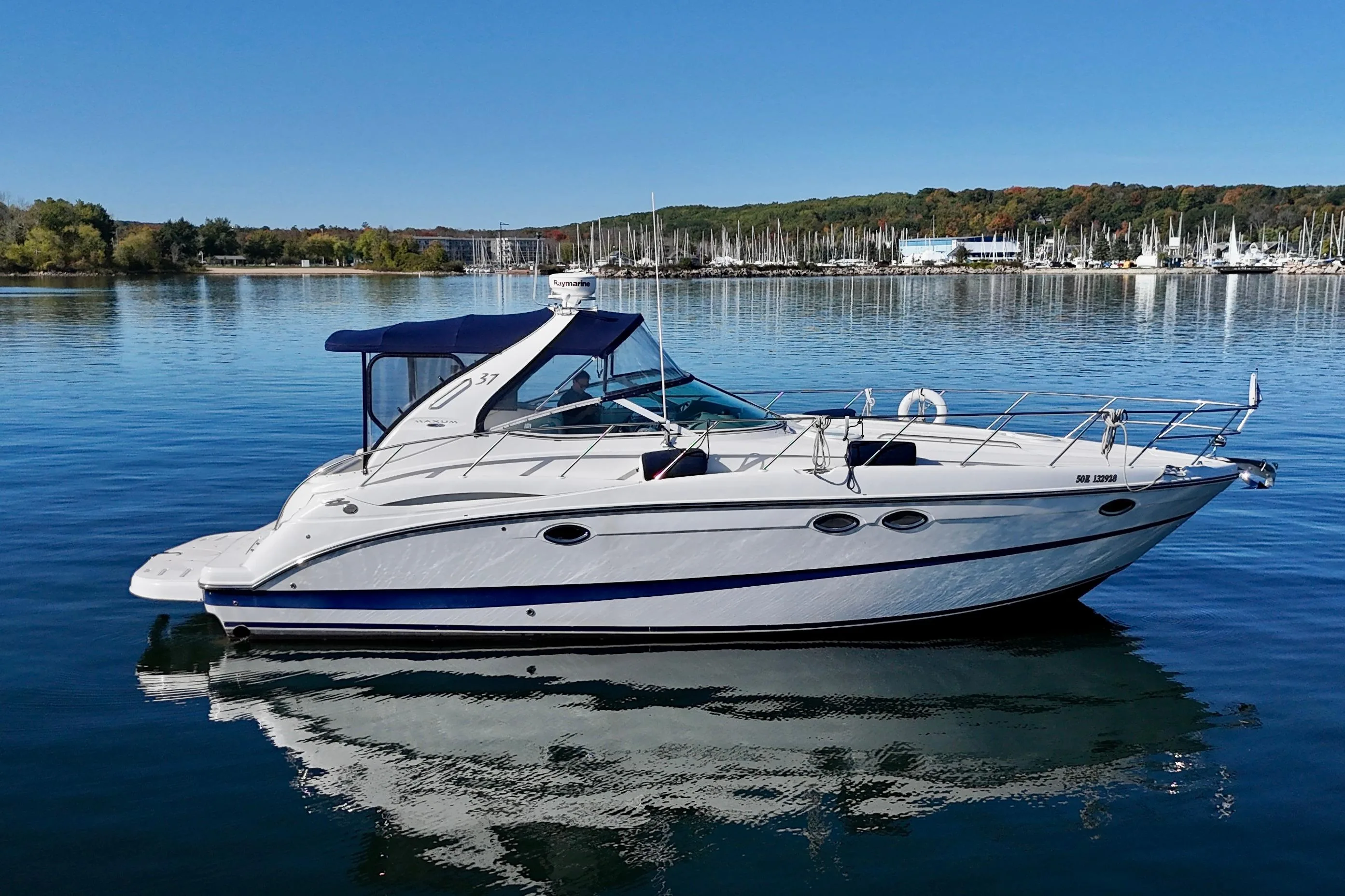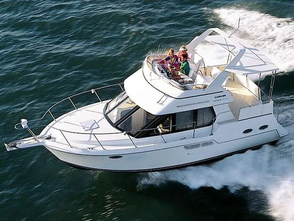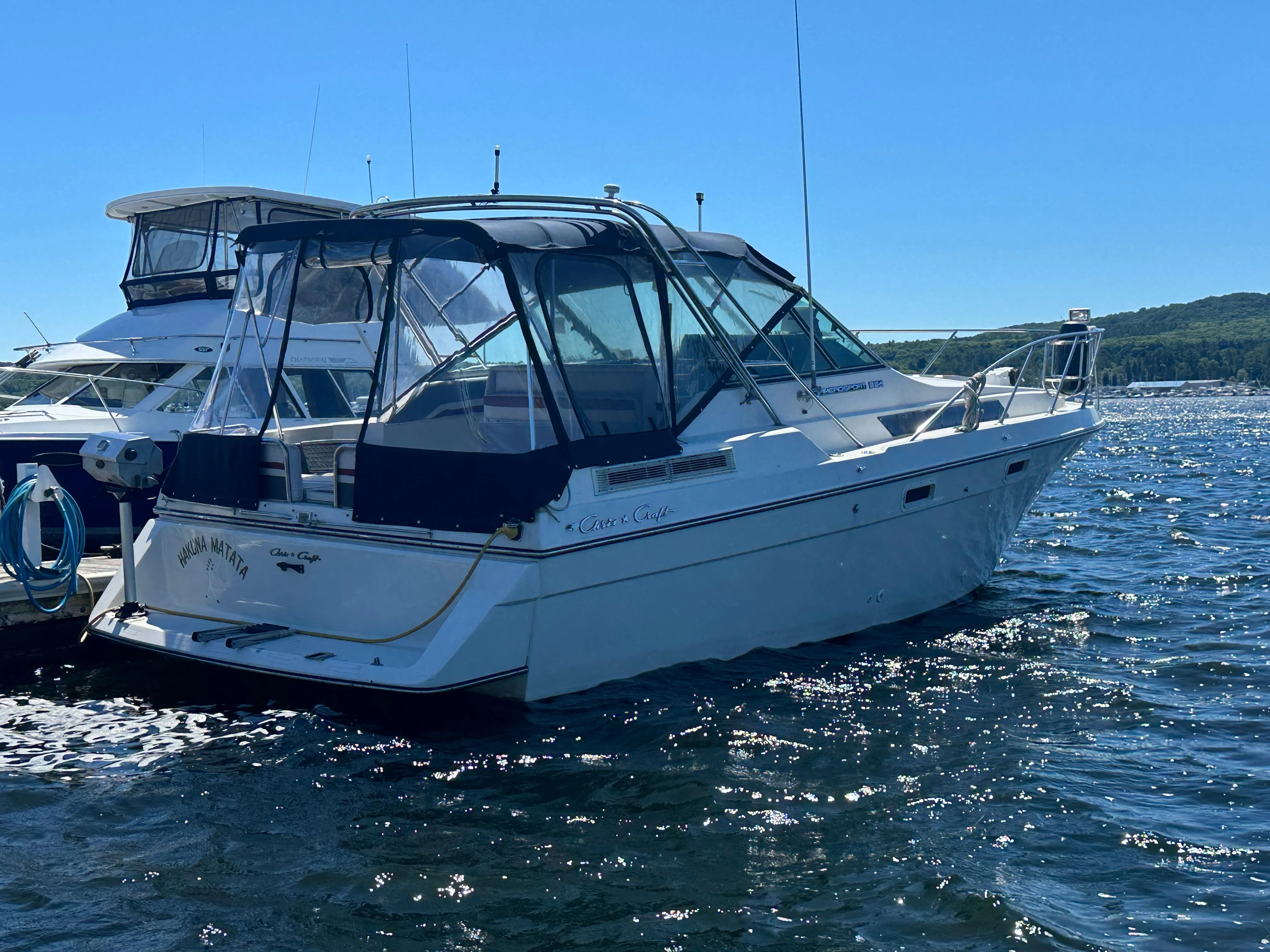 - Cabin features fully enclosed head with shower, galley, entertainment center and convertible V-berth for overnight stays