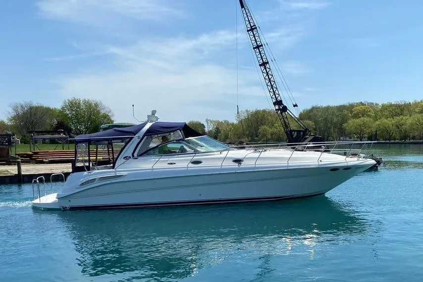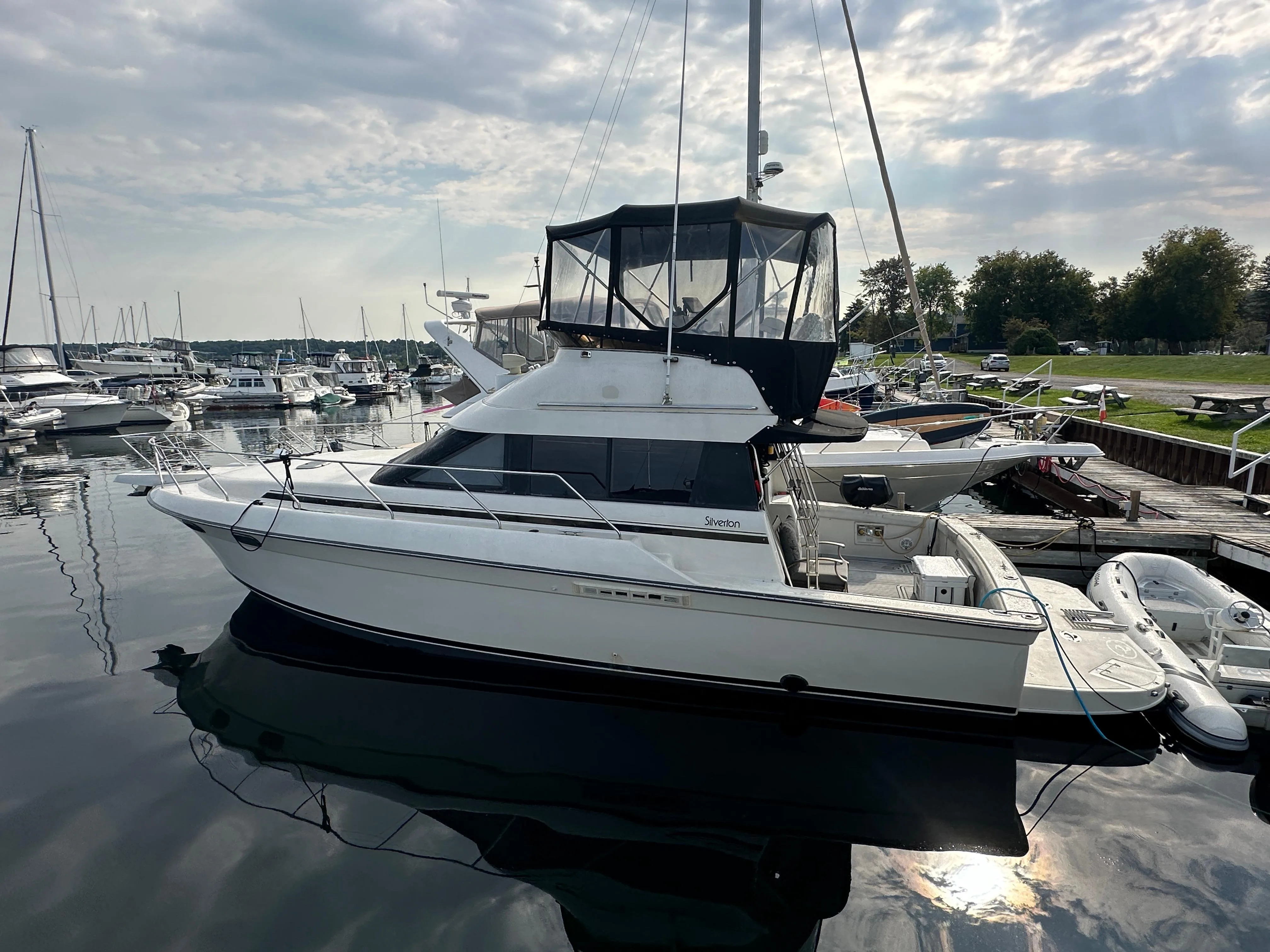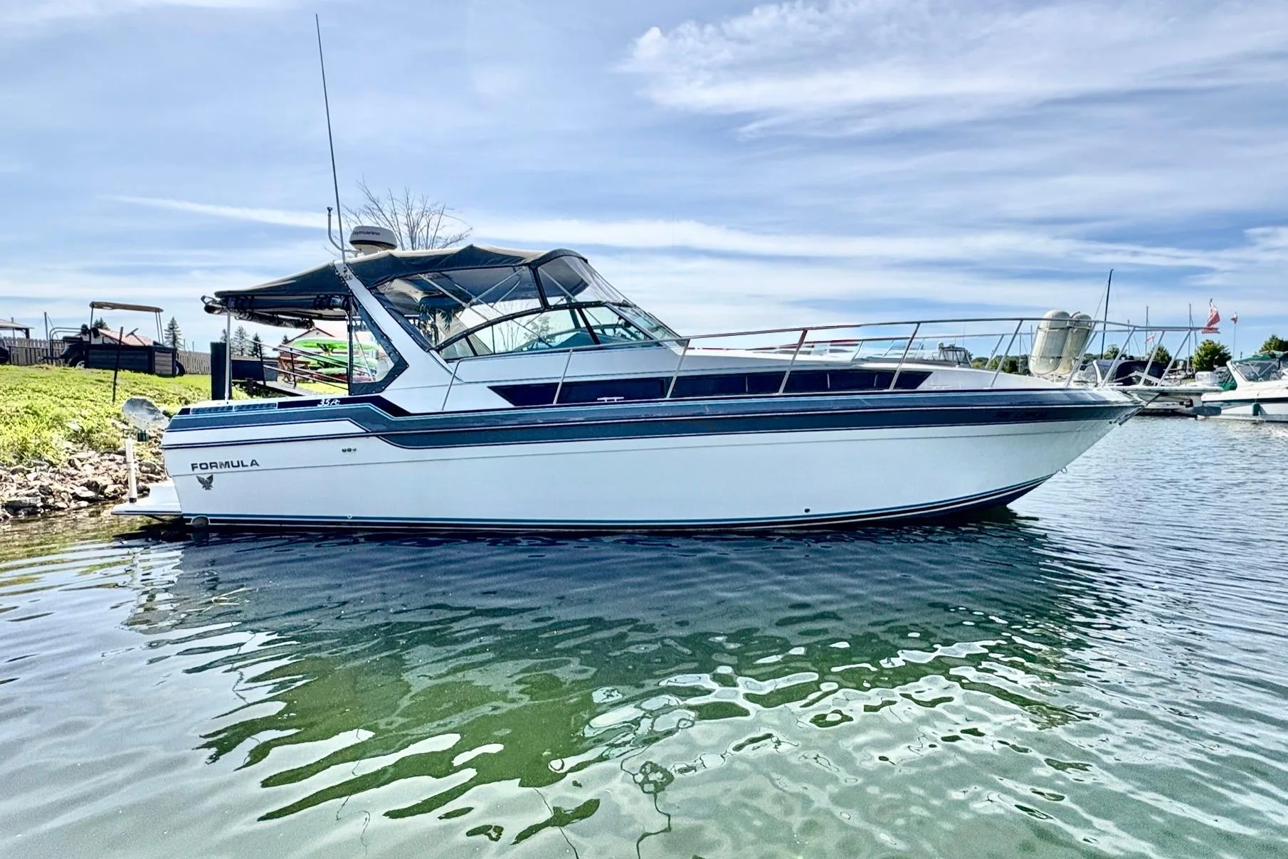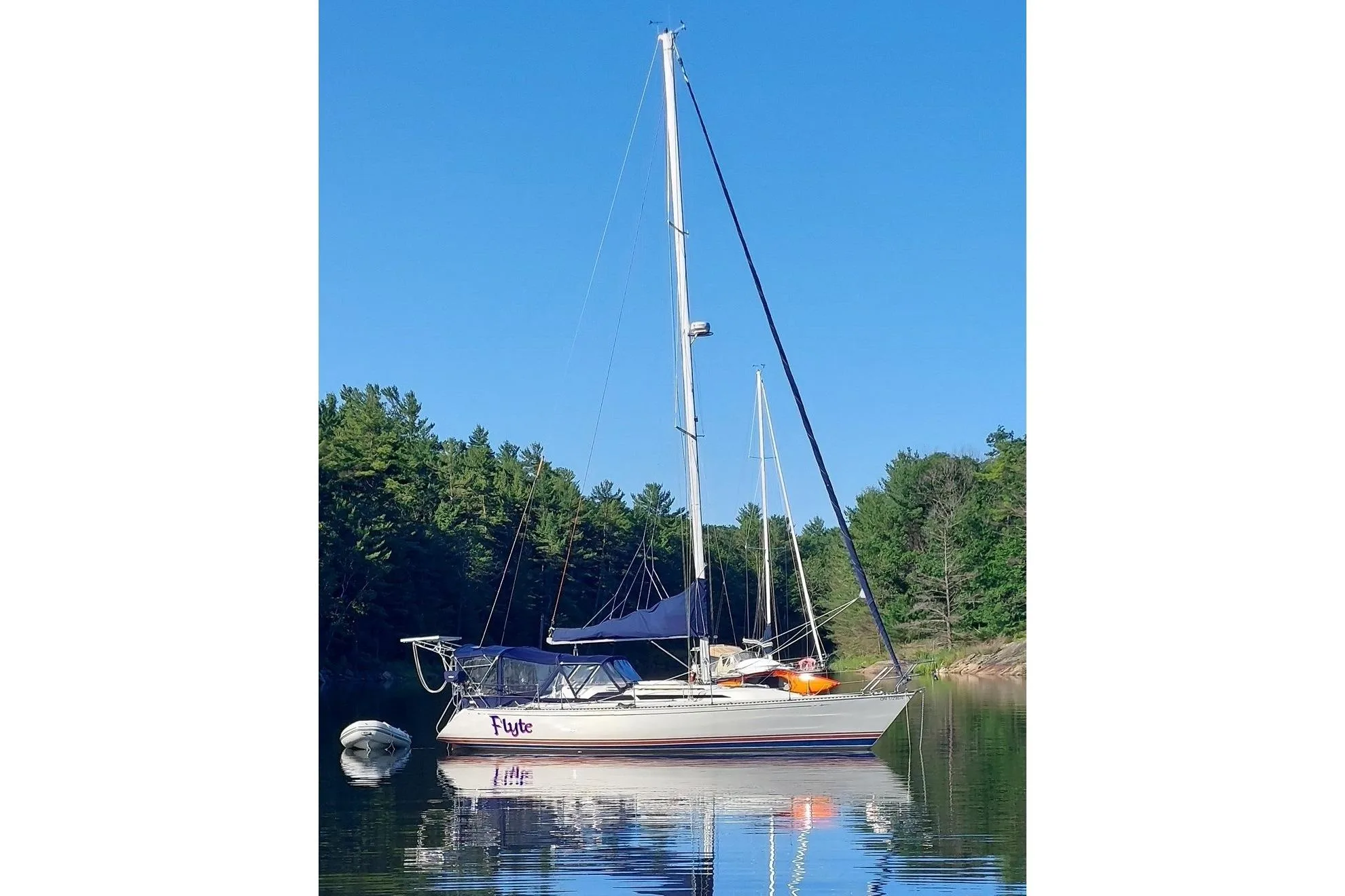 - Cabin features fully enclosed head with shower, galley, entertainment center and convertible V-berth for overnight stays